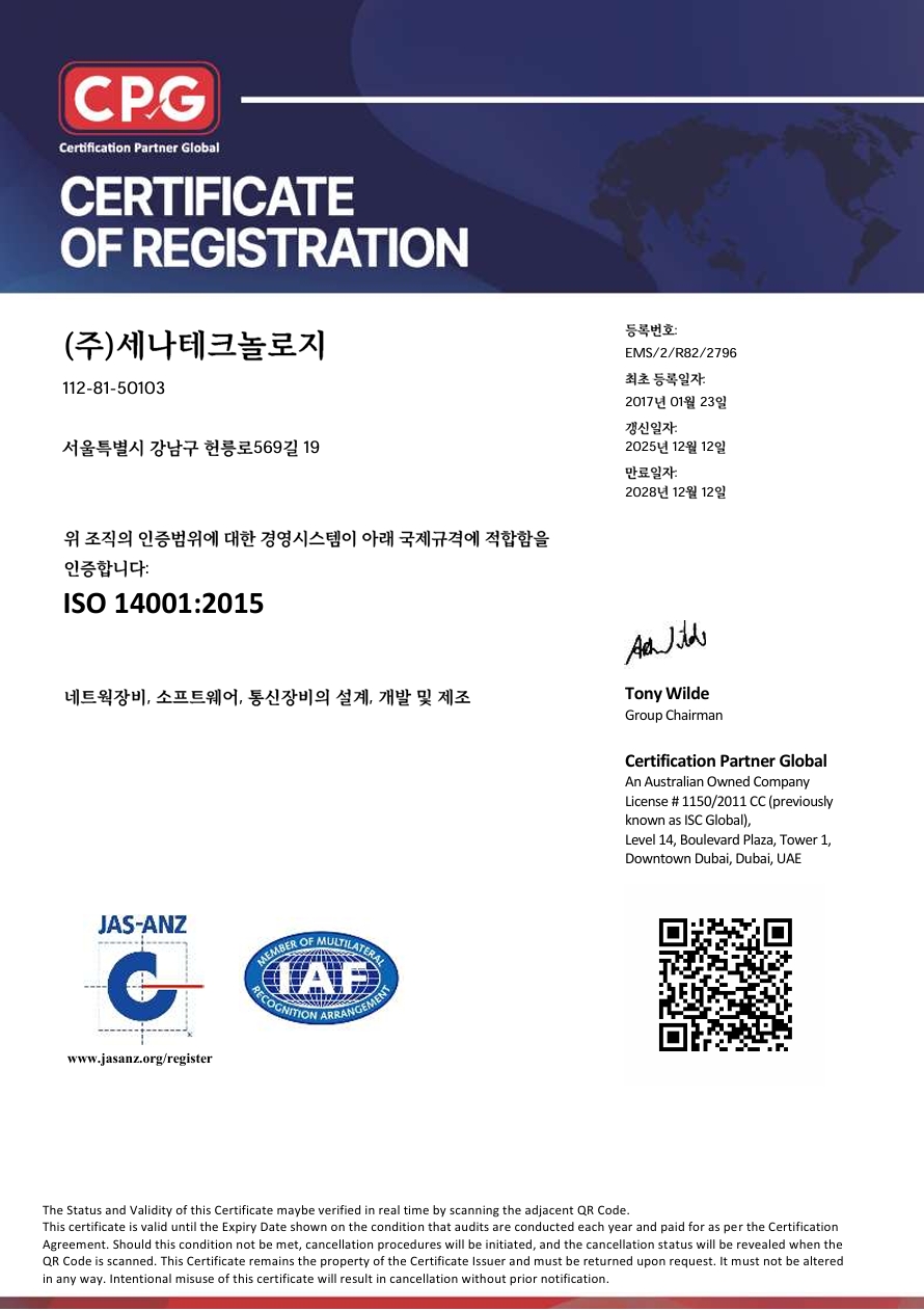 ISO 14001 인증을 취득하여 규격에 따라 환경경영체제를 구축하여 이행하고 있습니다.