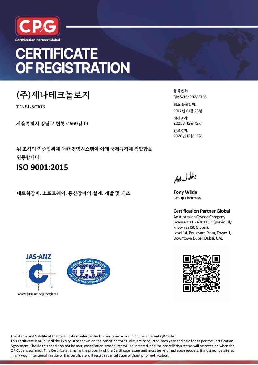 ISO 9001 인증을 취득하여 규격에 따라 품질경영체제를 구축하여 이행하고 있습니다.